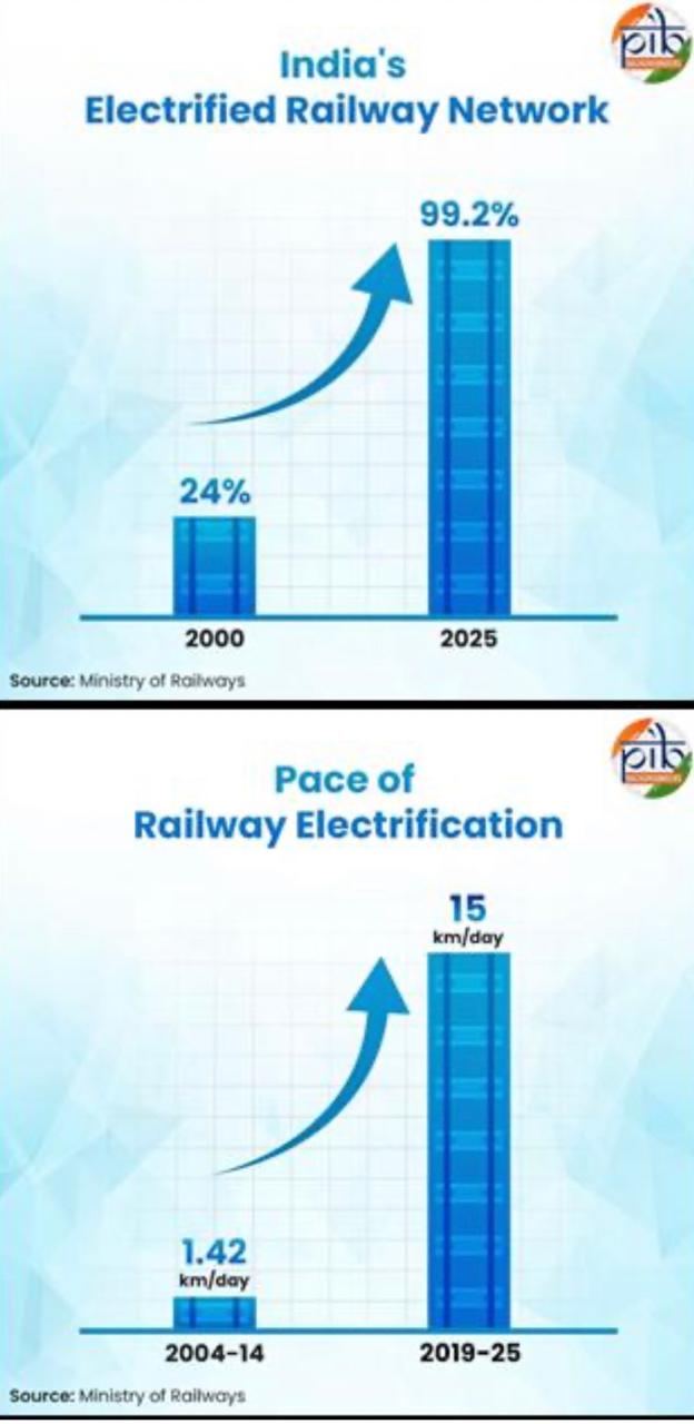Indian Railways has electrified about 99.2% of its network by November 2025, making it one of the world’s most extensively electrified rail systems.