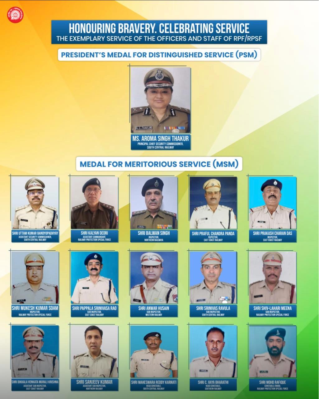 On the occasion of Republic Day, 2026, the Hon’ble President of India, Smt. Droupadi Murmu has awarded the President’s Medal for Distinguished Service (PSM) and the Medal for Meritorious Service (MSM) to officers and personnel of the Railway Protection Force (RPF) and Railway Protection Special Force (RPSF) in recognition of their dedicated service, professionalism and exemplary contribution to railway security.